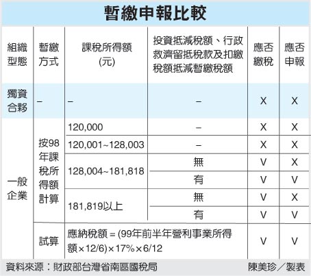 全台逾70萬家營利事業中,除獨資合夥事業可免申報並免繳納暫繳稅款外,一般非獨資合夥事業計算出的應納暫繳稅額如在新台幣2,000元以下者,也可以免辦理暫繳申報。