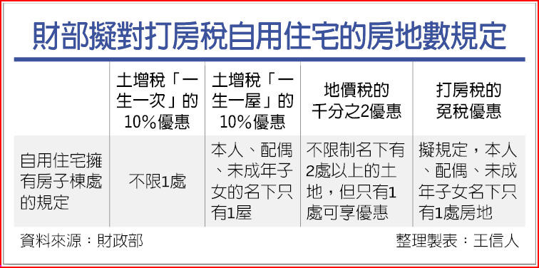 而「一生一屋」的規定,本人、配偶、未成年子女的1家人中,只能有1屋為自用住宅用地。財政部打算根據「一生一屋」的定義,從嚴規定特別稅的自用住宅,舉例,如果1家人有有第2棟房子,就不能適用特別稅的免稅優惠。